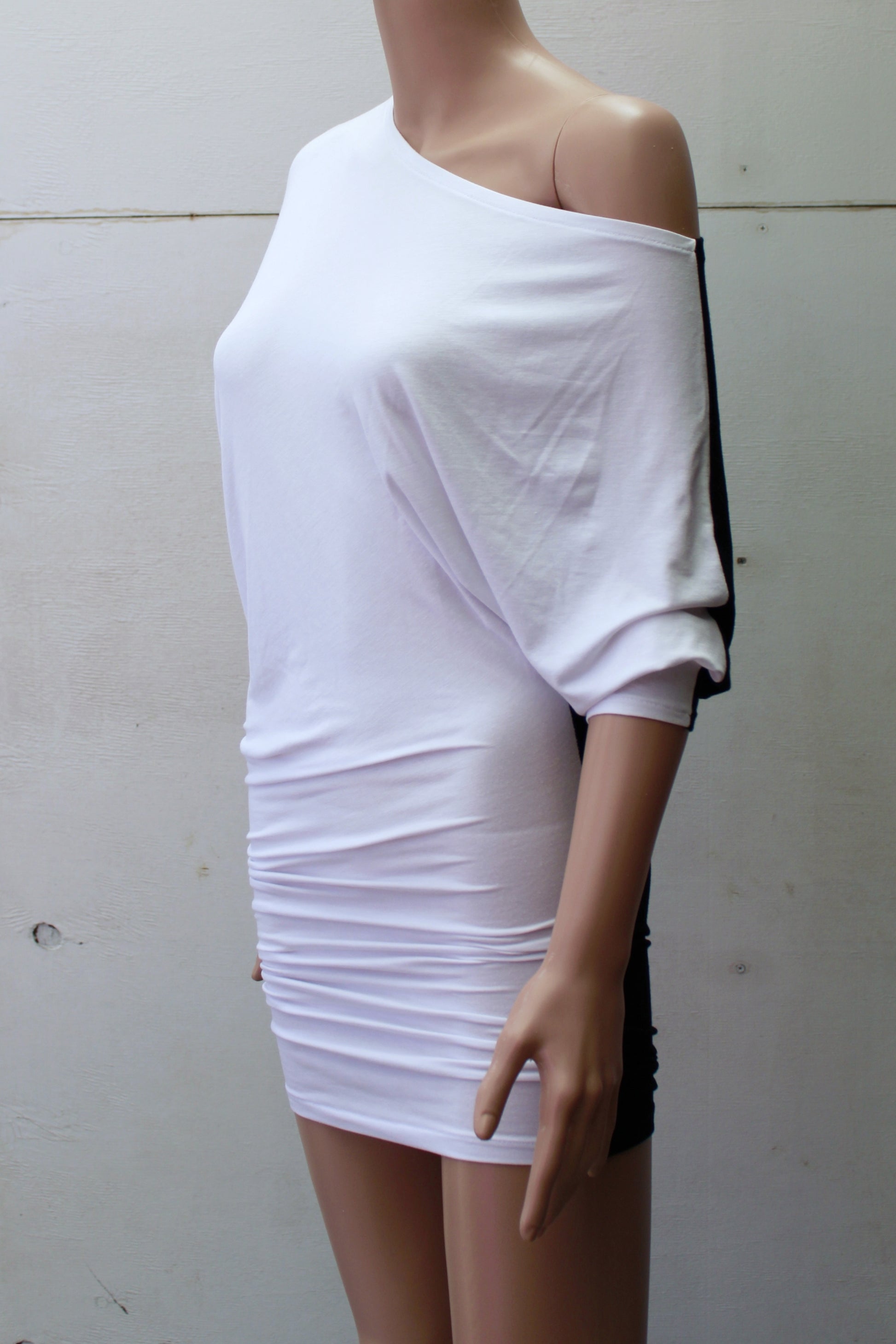 - Escote asimétrico que puede ser usado de distintas formas, dando así diferentes efectos de drapeado
